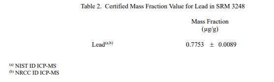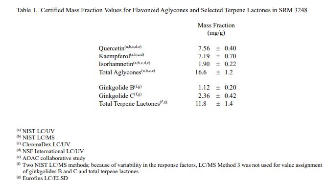 NIST 認證值是 NIST 對其準確性有最高置信度的值,因為所有已知或可疑的偏差來源都已調查或考慮在內 [1]。表 1 和表 2 中提供了選定類黃酮、萜內酯和鉛的認證濃度值。這些值來自 NIST 和合作實驗室提供的結果的組合。該材料中的認證值是各組 NIST 結果的同等加權平均值和合作實驗室進行的組合測量值的平均值;相關的不確定性是 95% 置信水平的擴展不確定性 [2,3]。以質量分數單位 [4] 以干質量為基礎報告值。