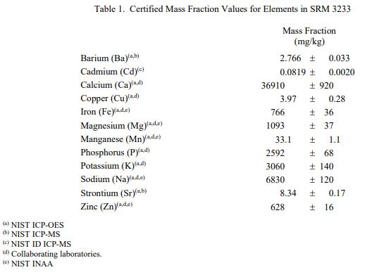 表 1 和表 2 提供了 SRM 3233 中元素和維生素的認證質量分數值,以干質量為基礎報告。NIST 認證值是 NIST 對其準確性有最高置信度的值因為所有已知或可疑的偏見來源都已被調查或考慮 [1]。價值分配分析由 NIST 和合作實驗室進行。認證值計算為 NIST 方法的平均值、美國農業部 (USDA) 方法的平均值以及合作實驗室提供的平均結果的中位數(如果適用)。所有值在沒有加權的情況下合并。相關的不確定性以 95% 的置信水平表示 [2-4]。