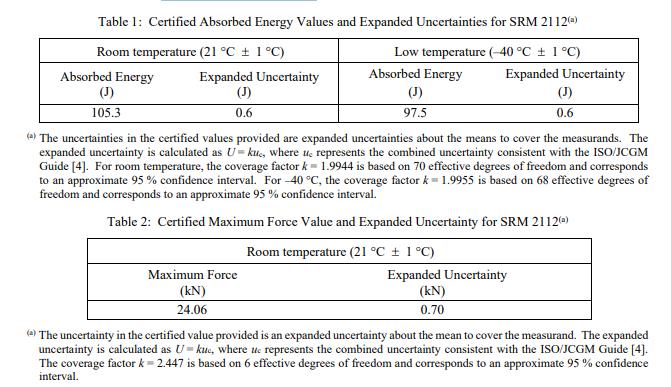 NIST 認(rèn)證值是 NIST 對(duì)其準(zhǔn)確性有最高置信度的值,因?yàn)樗幸阎蚩梢傻钠顏?lái)源都已被調(diào)查或考慮 [3]。可追溯性是國(guó)際單位制 (SI) 焦耳(吸收的能量)和千牛頓(力)單位。為 NIST SRM 2112動(dòng)態(tài)沖擊力驗(yàn)證樣本(標(biāo)準(zhǔn)品) 樣品確定的認(rèn)證值在表 1 和表 2 中給出。